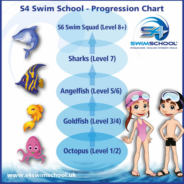 For our S4 Teaching Groups (children aged 3yrs+ approx.), we follow the Swim England Award Scheme, stages 1 - 7, from Octopus to Goldfish to Angelfish to Sharks and finally S6 Swim Squad.